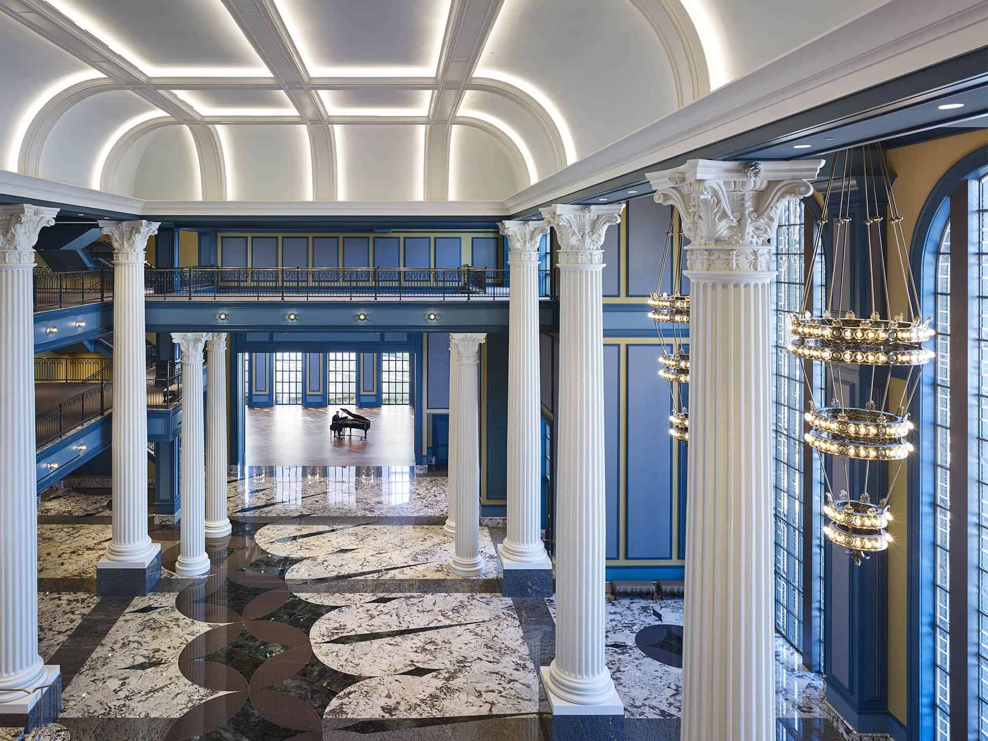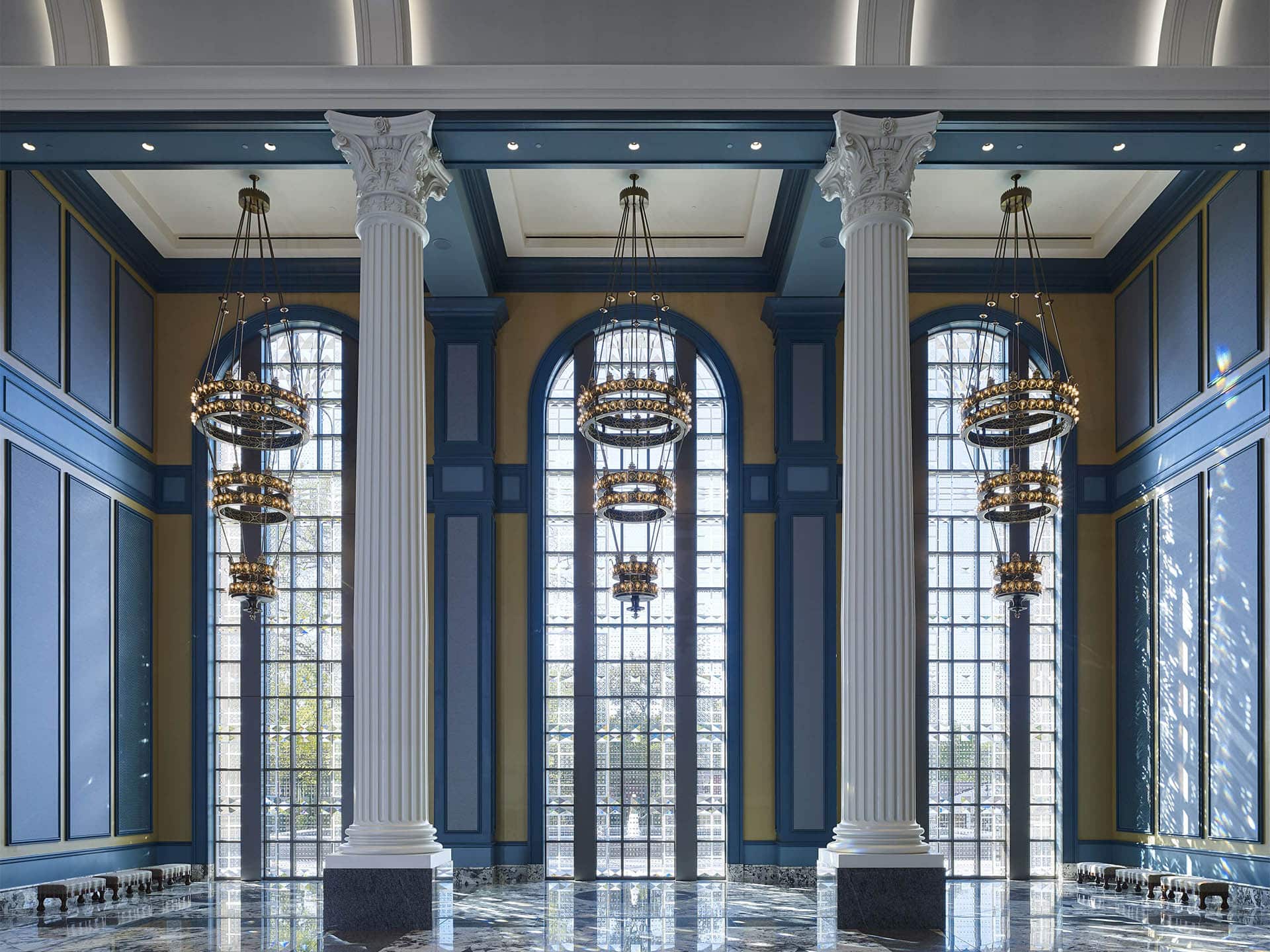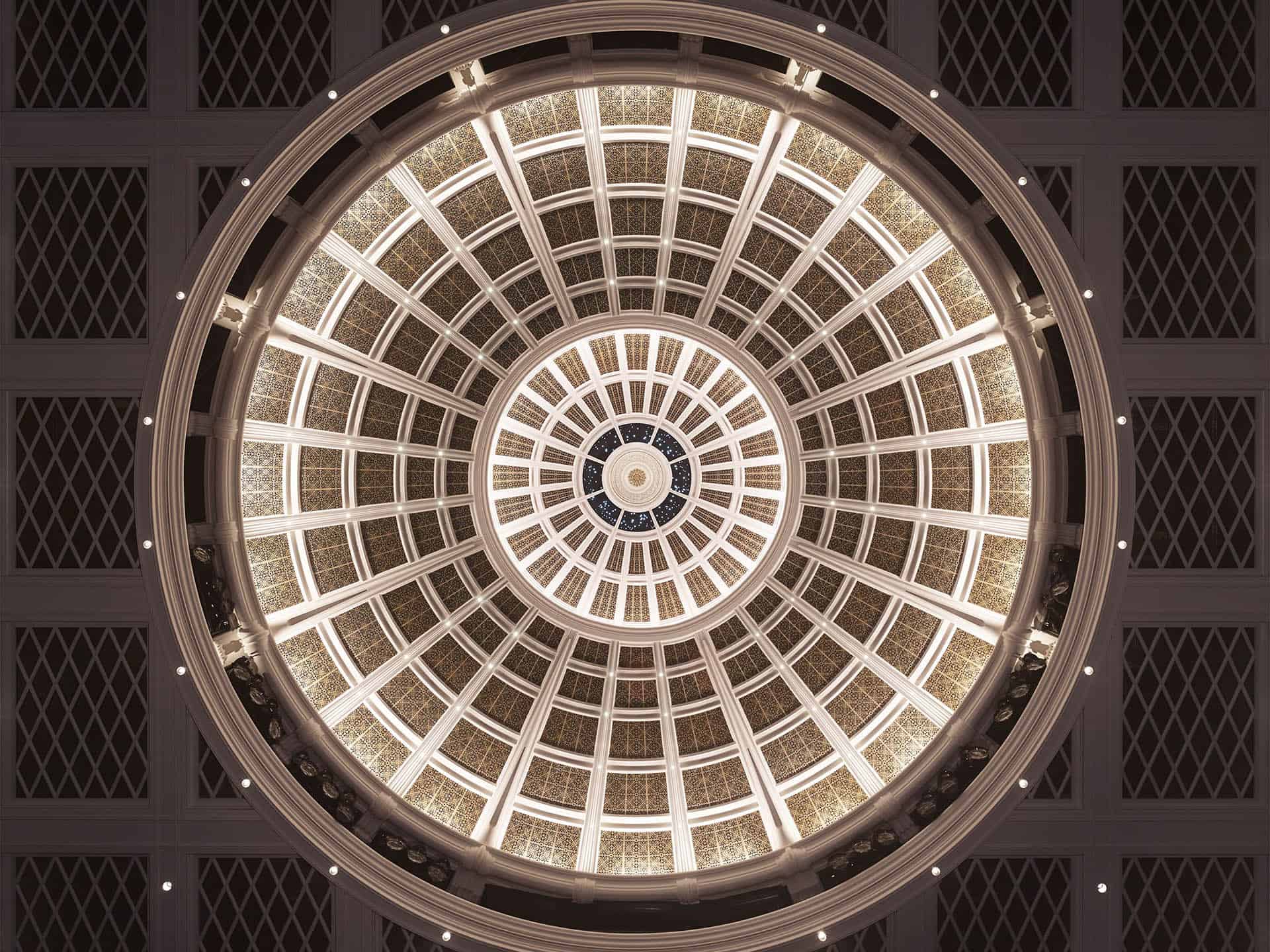 - Integration of a custom transparent sound dome with commemorative LED constellation and three monumental chandeliers