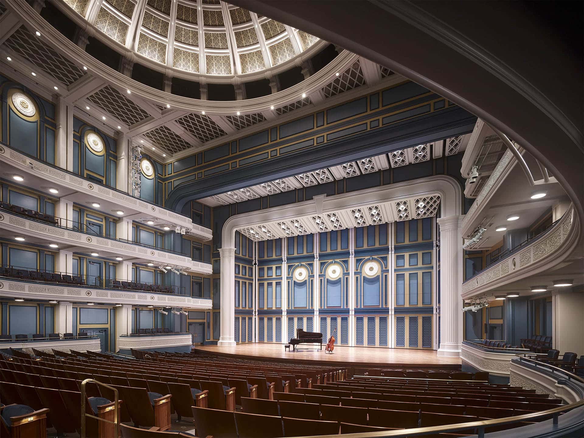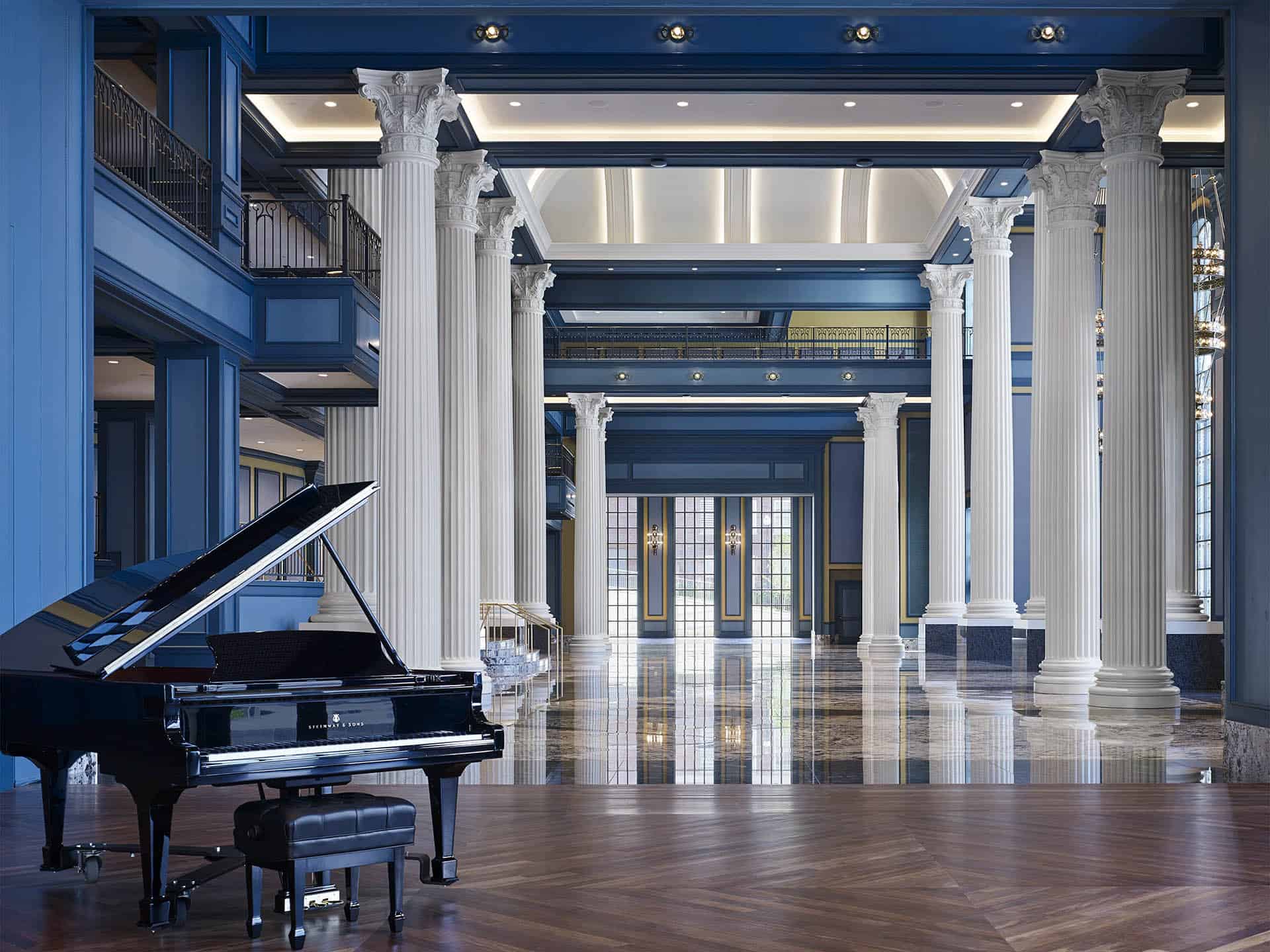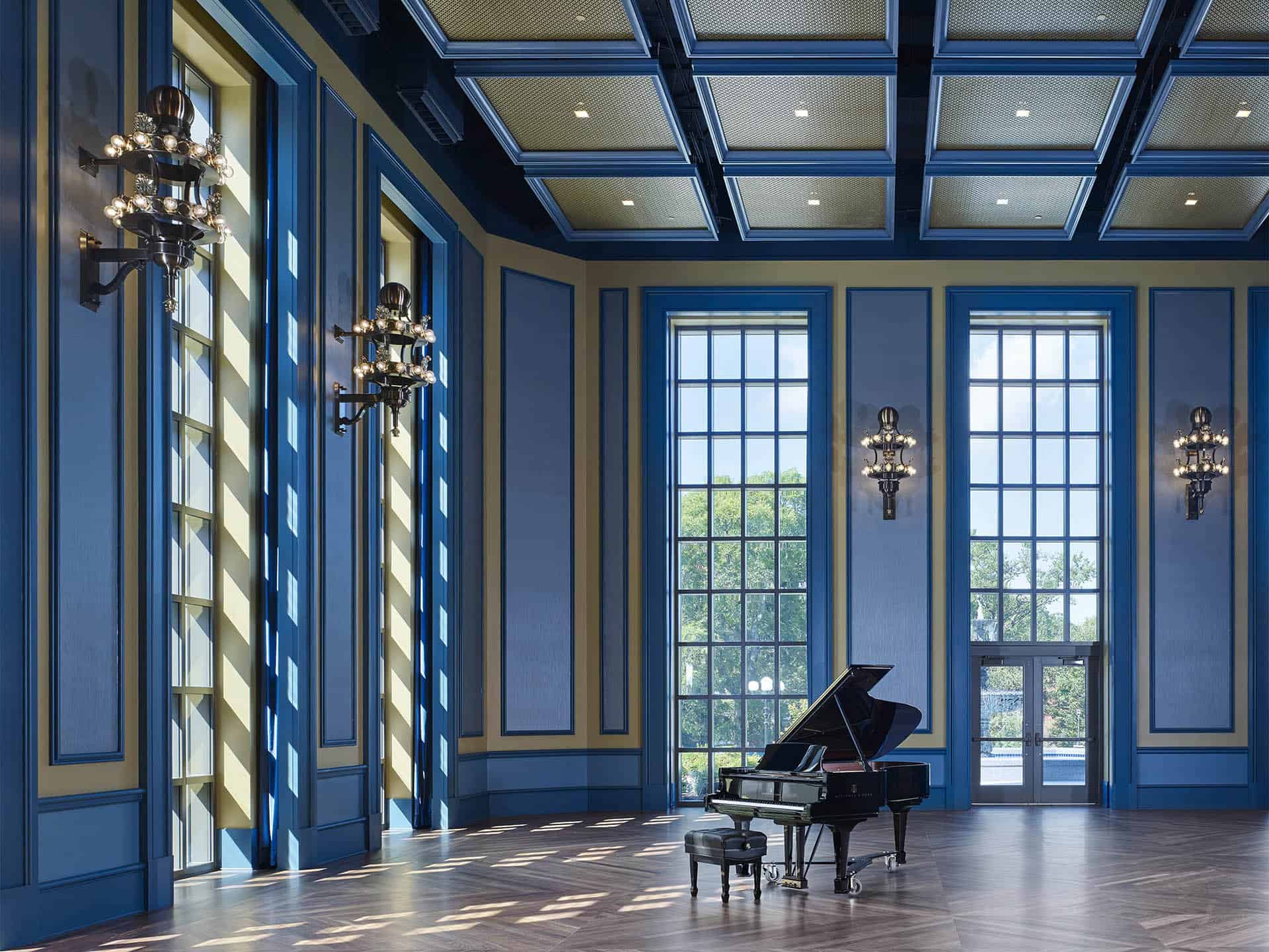 - Integration of a custom transparent sound dome with commemorative LED constellation and three monumental chandeliers